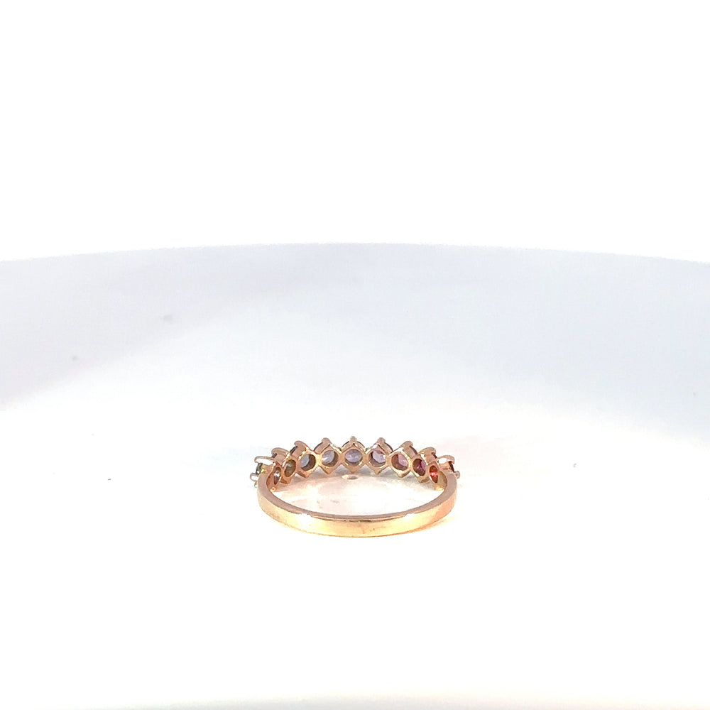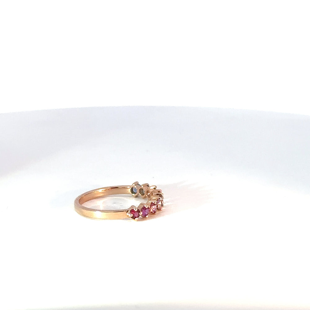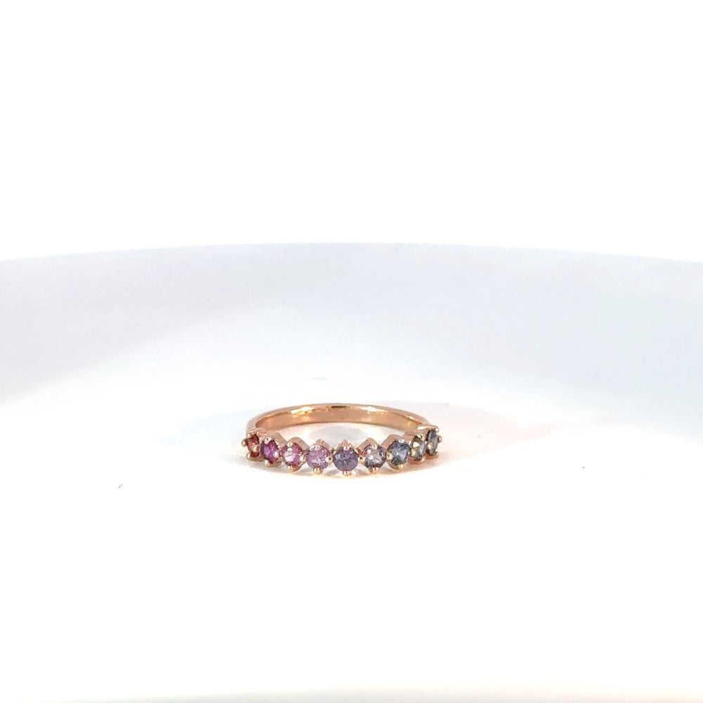 Celebra cada matiz de la vida con este elegante anillo tipo banda, elaborado en oro rosa brillante. Adornado con zafiros redondos de corte brillante en una armoniosa paleta de colores que incluye delicados tonos rosados, este anillo irradia sofisticación y alegría, perfecto para añadir un toque de color a tu día a día.