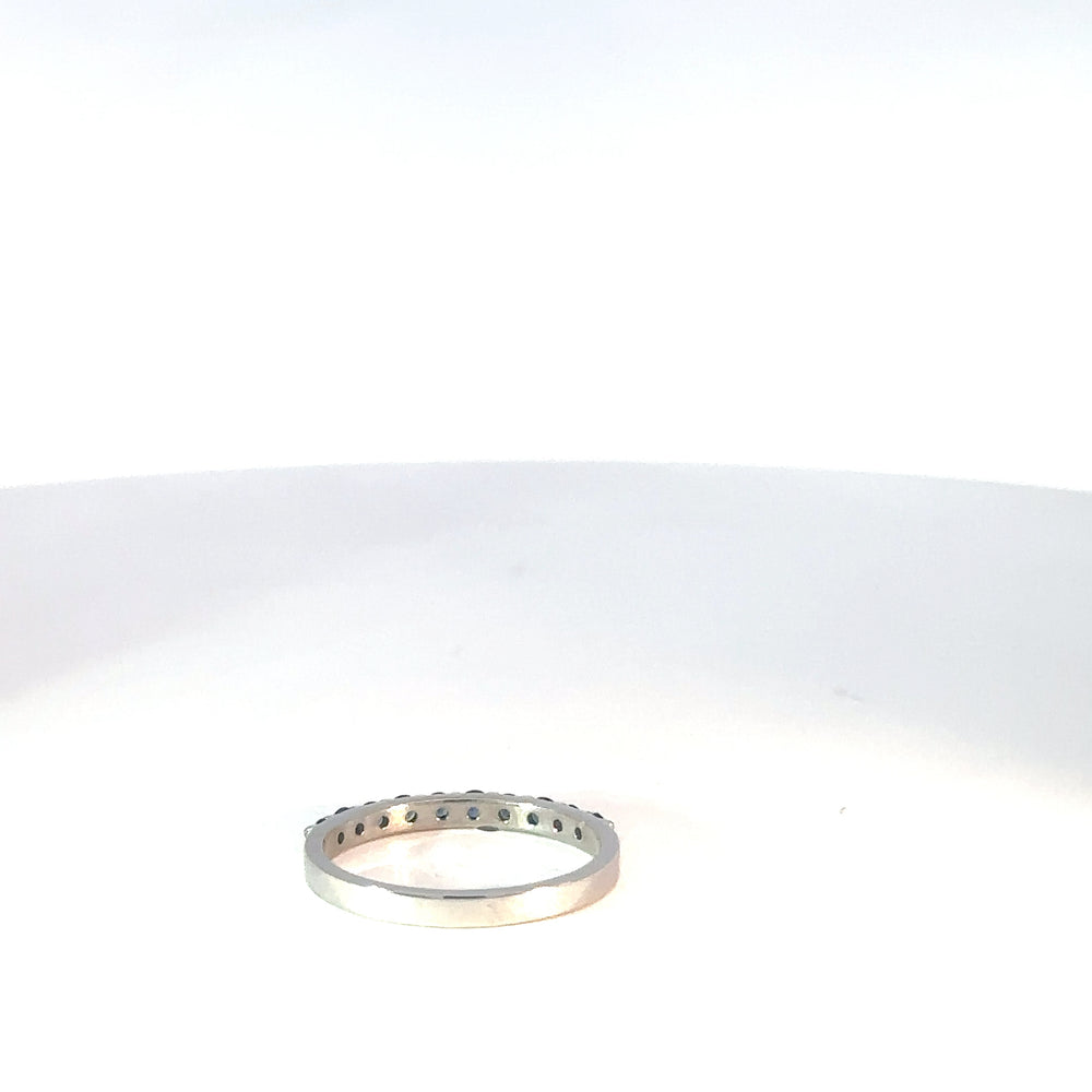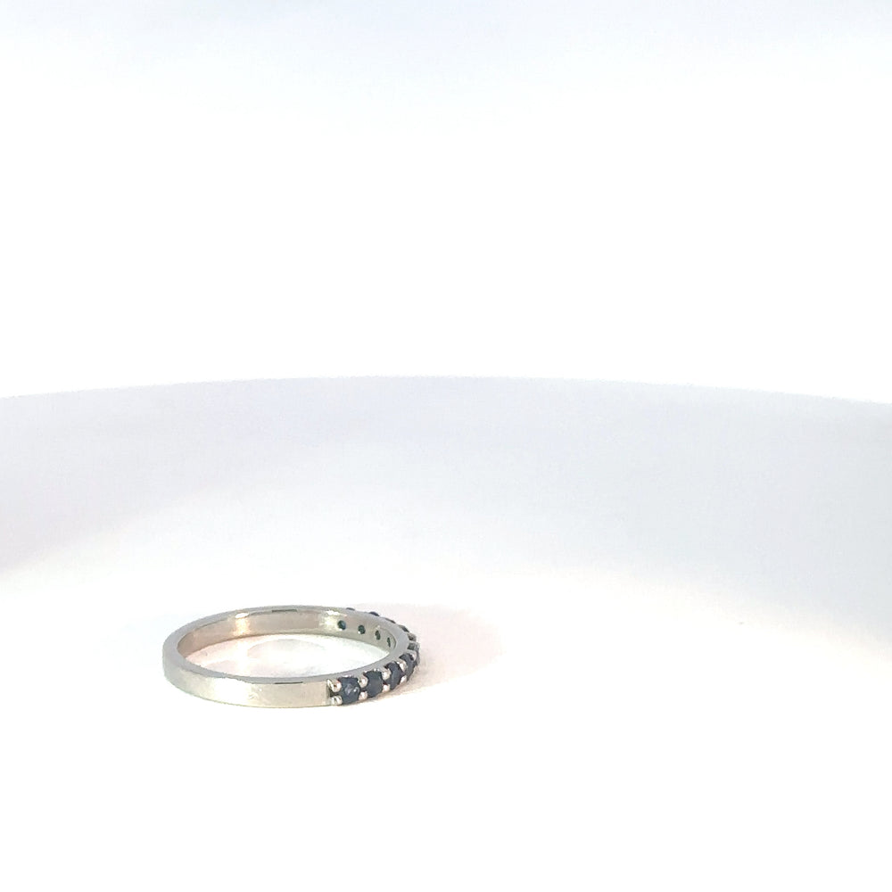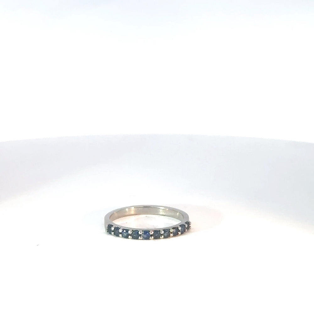 Este elegante anillo cintillo, elaborado en oro blanco 18k, presenta una hilera continua de zafiros genuinos de talla brillante. La pureza VS y el color azul real de las gemas garantizan un brillo y una claridad excepcionales. Una joya atemporal que simboliza un amor eterno.