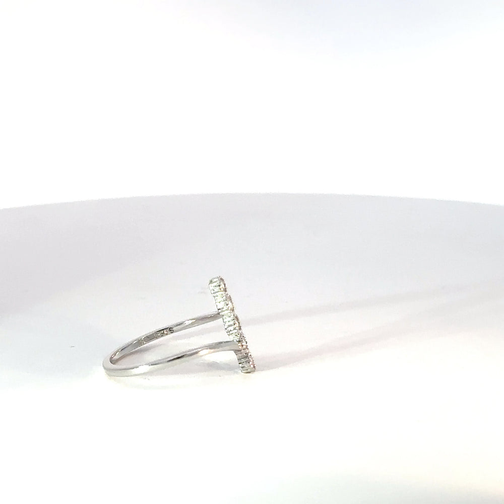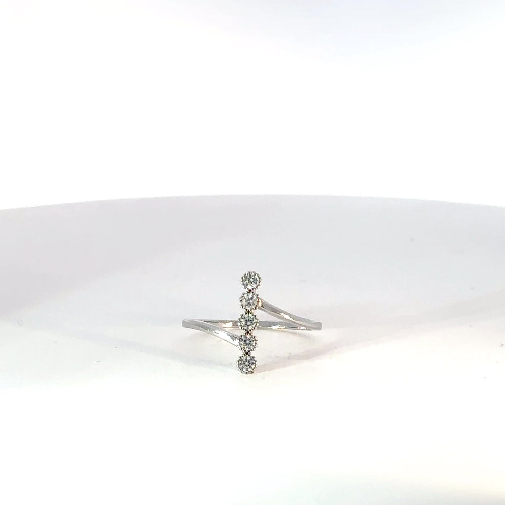 Anillo multistone de plata con baño de oro blanco, engastado con circones de talla brillante. El diseño minimalista y elegante, destaca por su composición de cinco circones redondos, distribuidos en una línea central que se abre creando un efecto visual sofisticado y moderno. Un accesorio luminoso y delicado, ideal para complementar cualquier estilo.
