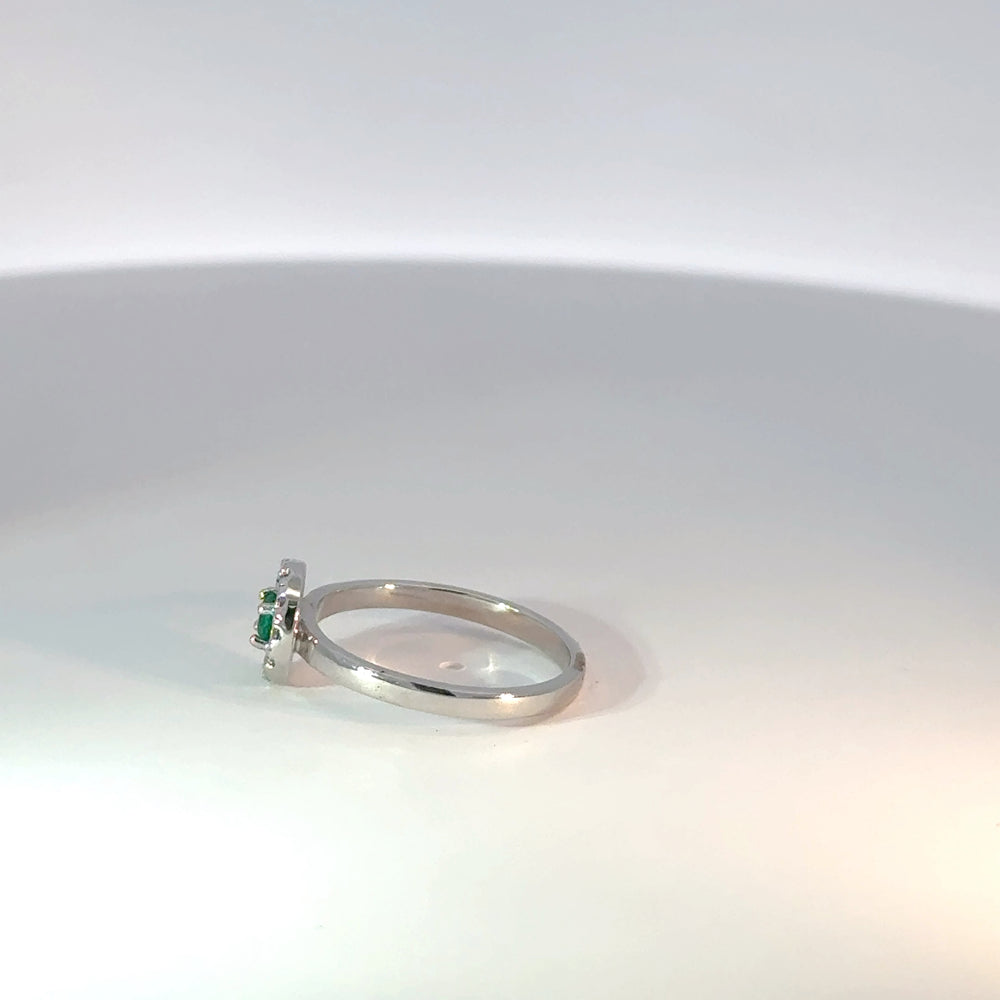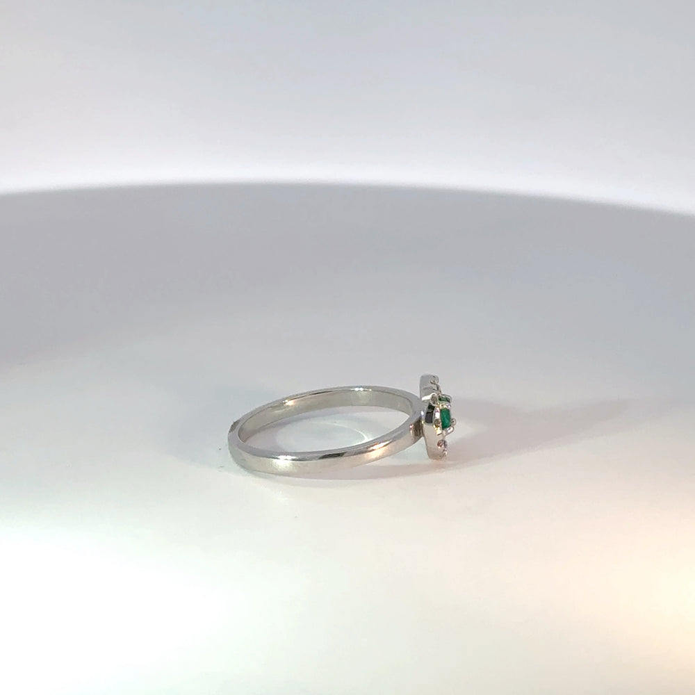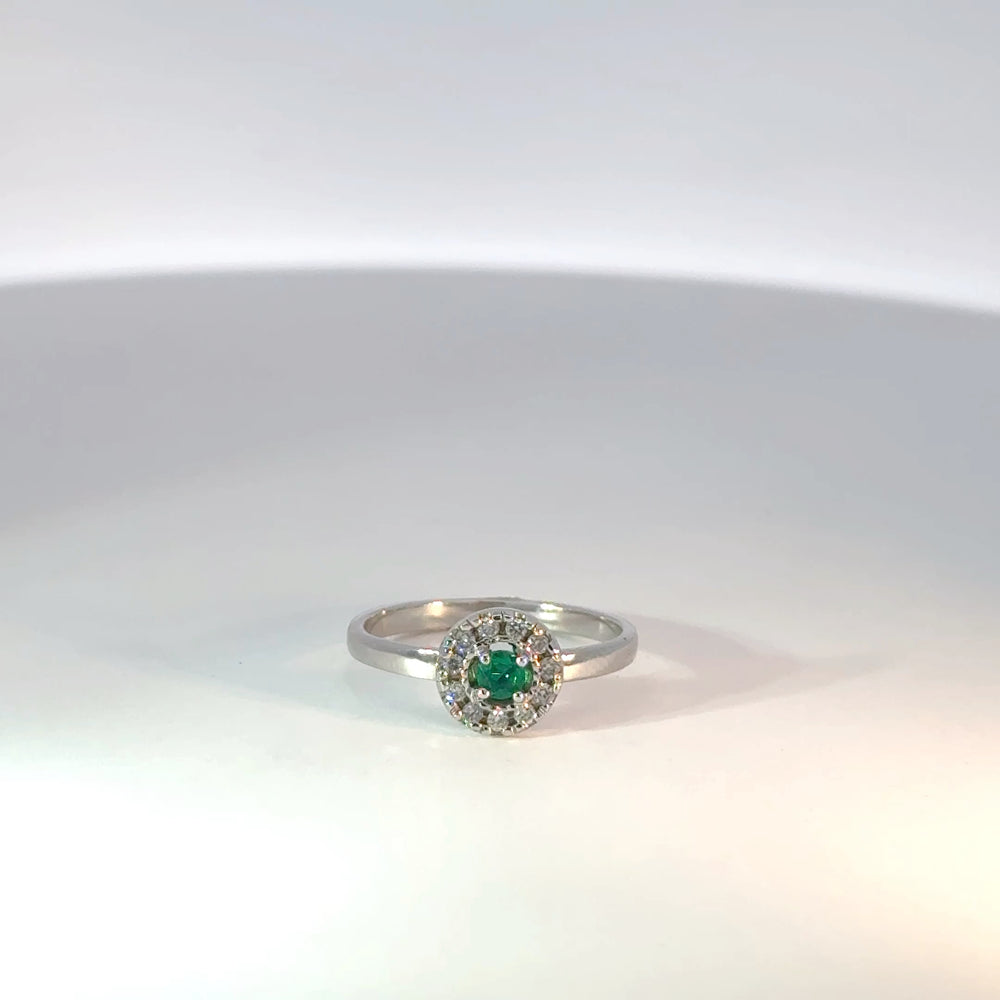 Realce su elegancia con este anillo en oro blanco 18k con una esmeralda central de 0.13ct y diamantes naturales alrededor 0.12ct. Esta joya, ideal para ocasiones especiales, combina el encanto clásico de la plata con el misterio de la esmeralda.