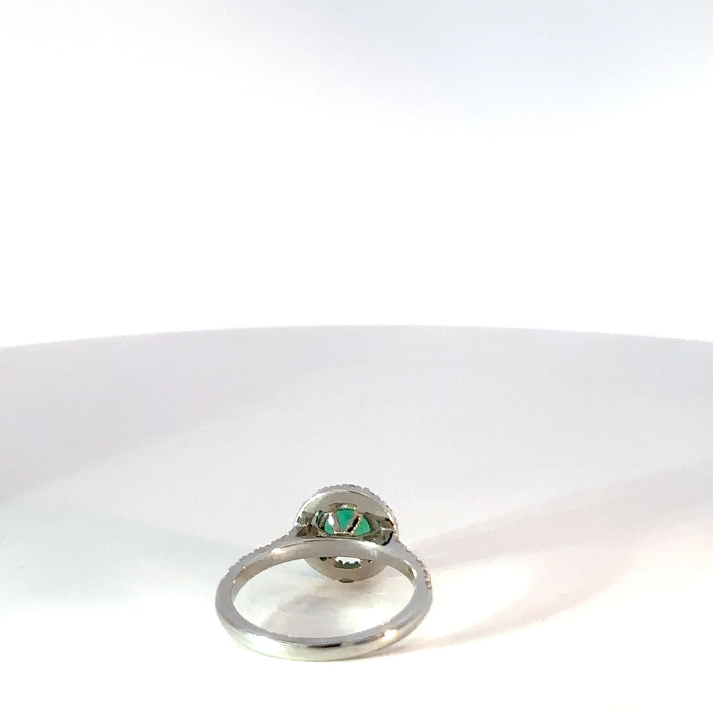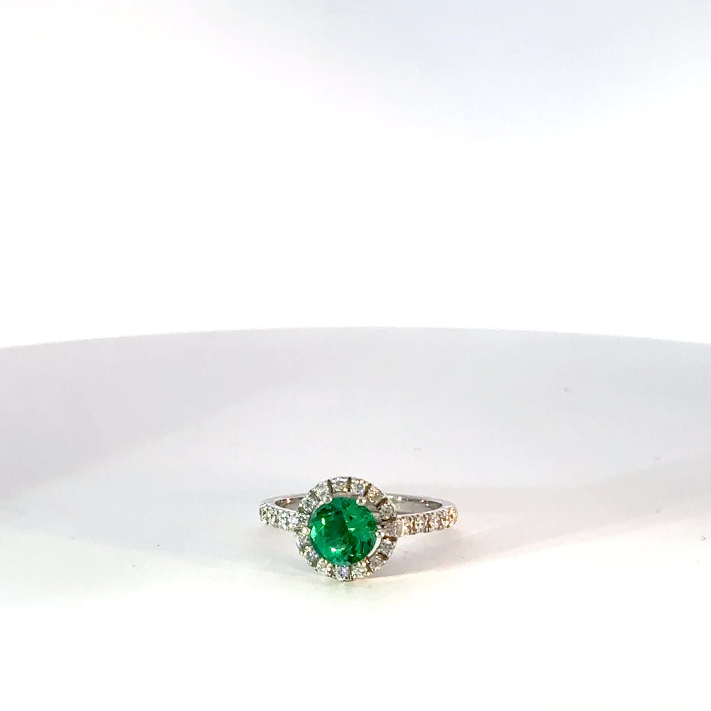 Este anillo elaborado en una montura de oro 18k con una esmeralda natural central de altísima calidad tipo exportacion de 0.86ct, rodeado por diamantes naturales de alta calidad 0.35ct. Un diseño clásico con un toque moderno.