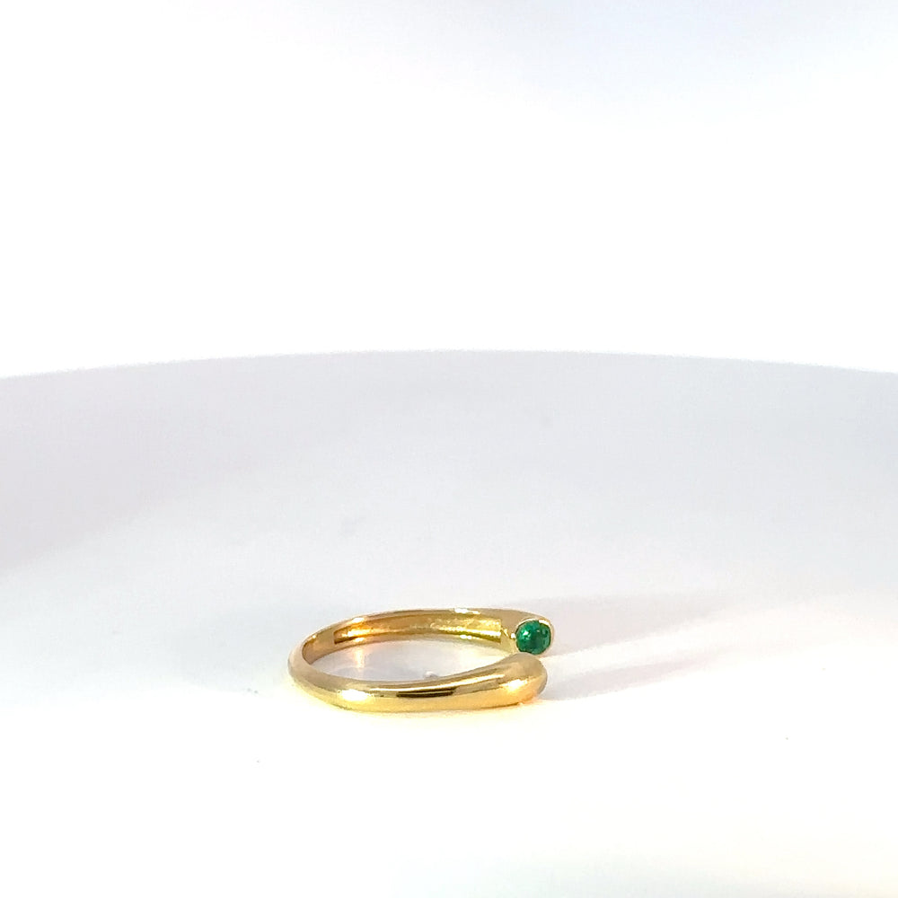 Elegante anillo tipo banda en oro amarillo 18k, diseñado para resaltar la belleza natural de las esmeraldas. Este anillo presenta dos exquisitas esmeraldas redondas 0.18ct, engastadas a los extremos, exhibiendo un vibrante color verde que evoca frescura y vitalidad. Una joya sofisticada que complementa cualquier atuendo con un toque de distinción.