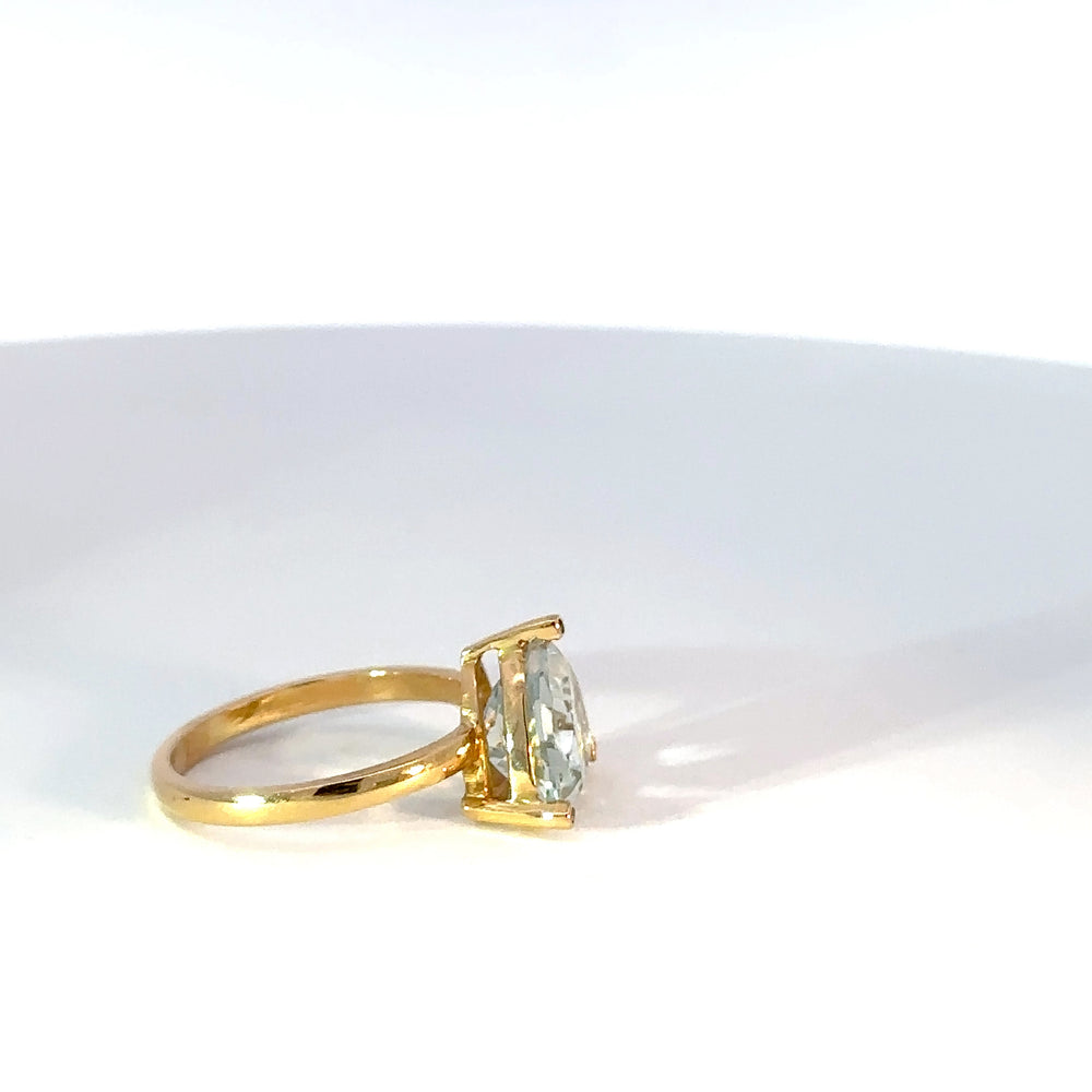 Este anillo tiene una montura de oro 18k con un topacio sky blue natural en corte trillion con 1 diamante en cada garra de la piedra central. La montura en oro amarillo complementa a la perfección la tonalidad verde azulada de la gema, cuyo estilo de talla mixta exhibe una transparencia y brillo excepcionales. Un diseño elegante para lucir en cualquier ocasión.
