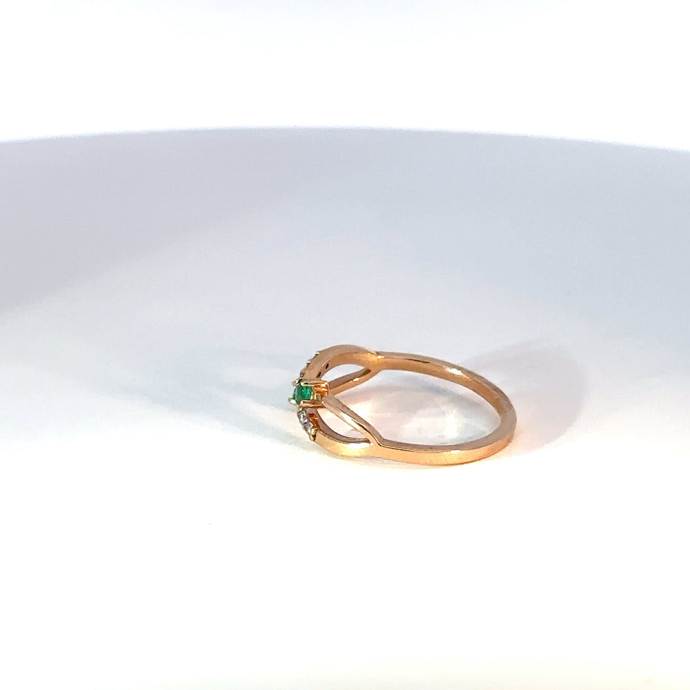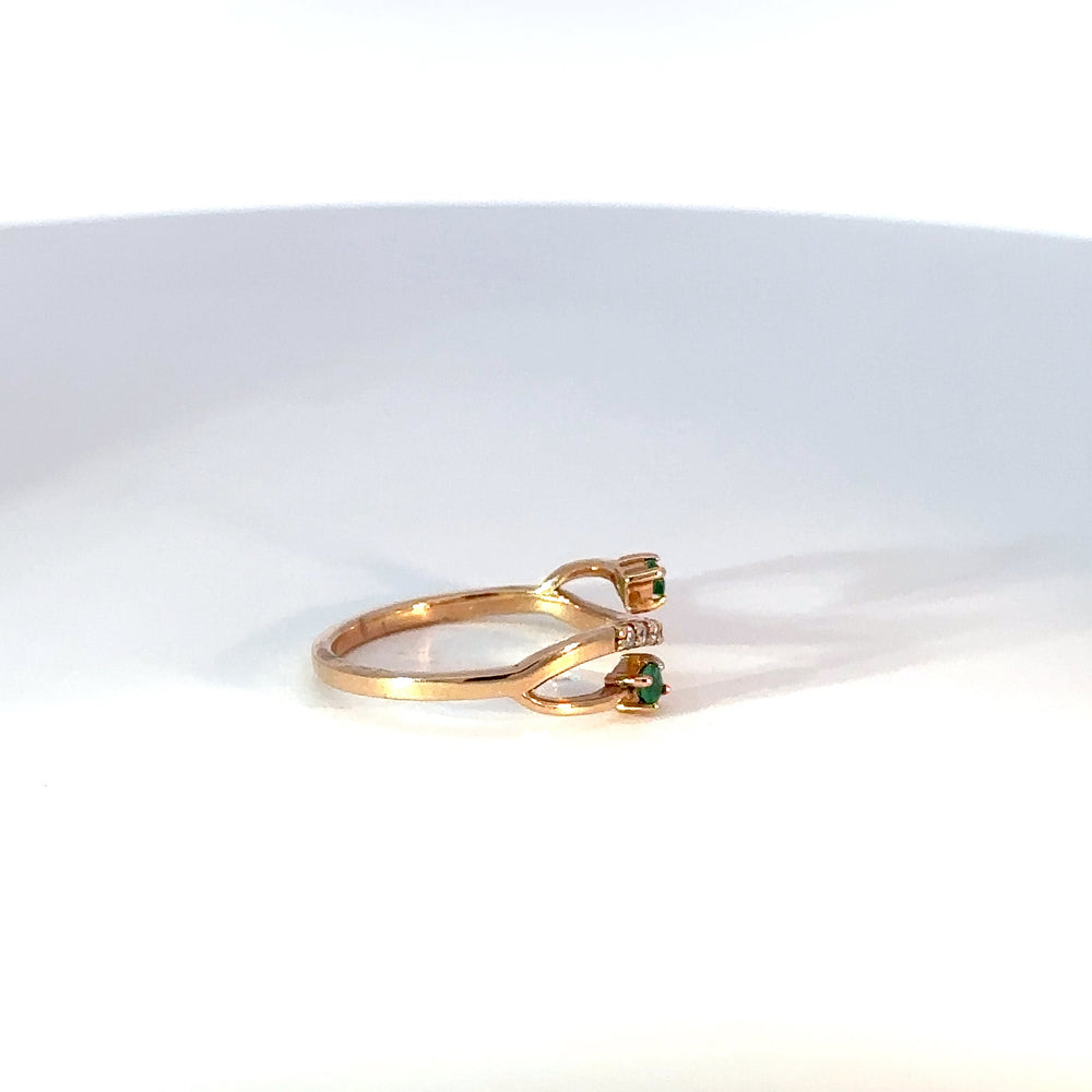 Este anillo está elaborado en oro rosado 18k con 2 esmeraldas naturales 0.16ct y una línea central de diamantes de alta calidad 0.07ct. La cuidadosa selección de los materiales y la artesanía detallada aseguran un brillo y una durabilidad excepcionales. Ideal para complementar cualquier atuendo con un toque de distinción.