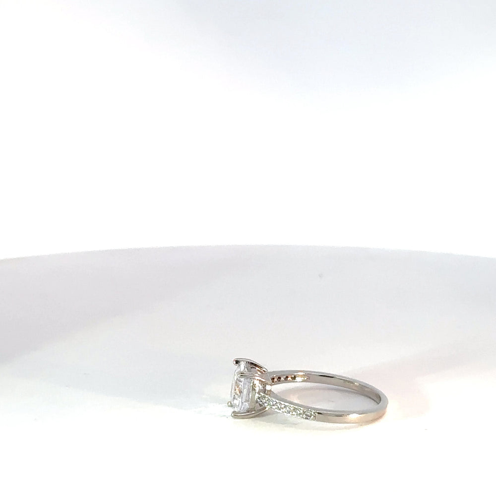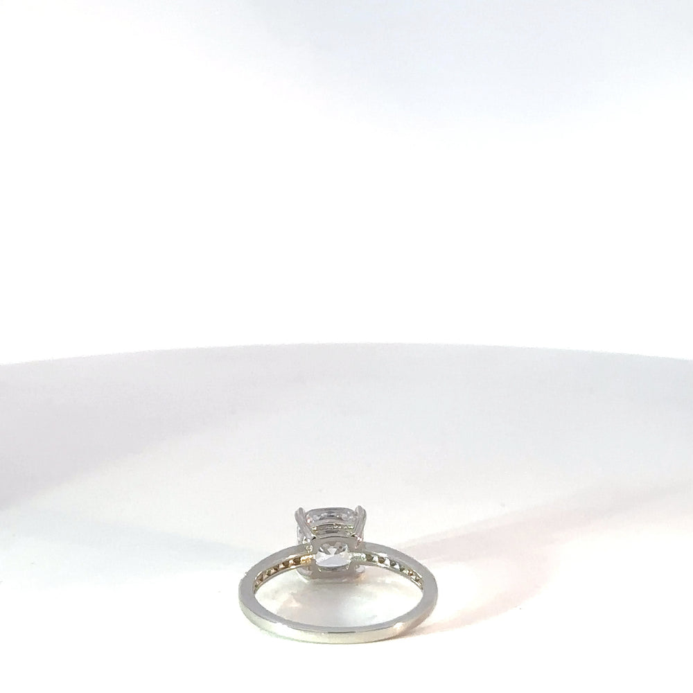 Anillo de compromiso elegante en plata de ley con detalles en oro blanco. Presenta un circón en corte brillante cojín, conocido por su excepcional brillo y atractivo clásico. Ideal para celebrar un compromiso con un toque de sofisticación y elegancia atemporal.
