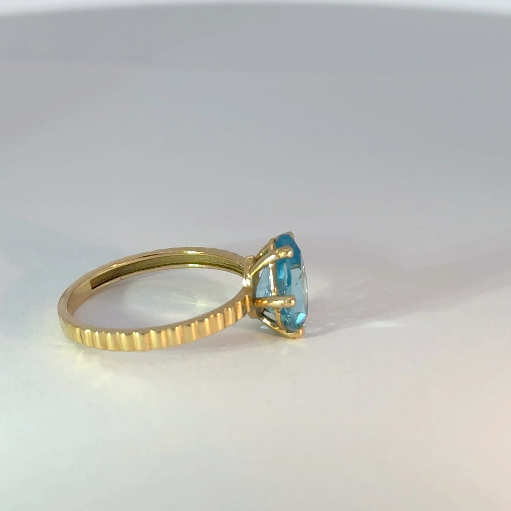 Anillo solitario en oro con un topacio azul 1.32ct de talla mixta en forma de pera. El diseño elegante realza la belleza de la gema central. Ideal para un toque de sofisticación y color en su colección de joyería.