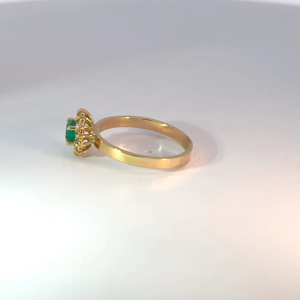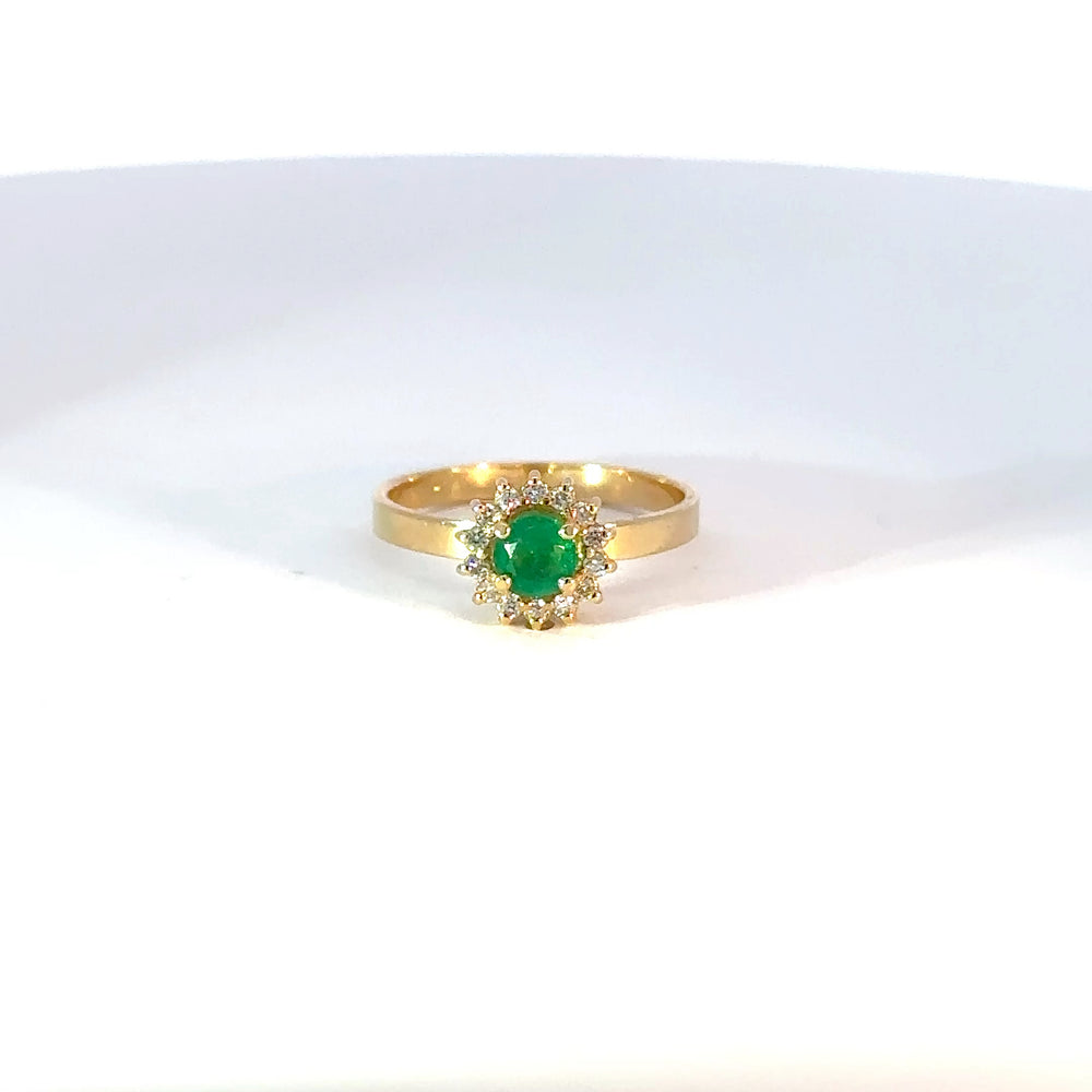 Celebre su amor eterno con este exquisito anillo de oro amarillo 18k con esmeralda natural central de 0.33ct con un cluster de diamantes naturales de 0.14ct. Una elección perfecta para la novia que aprecia la elegancia atemporal.