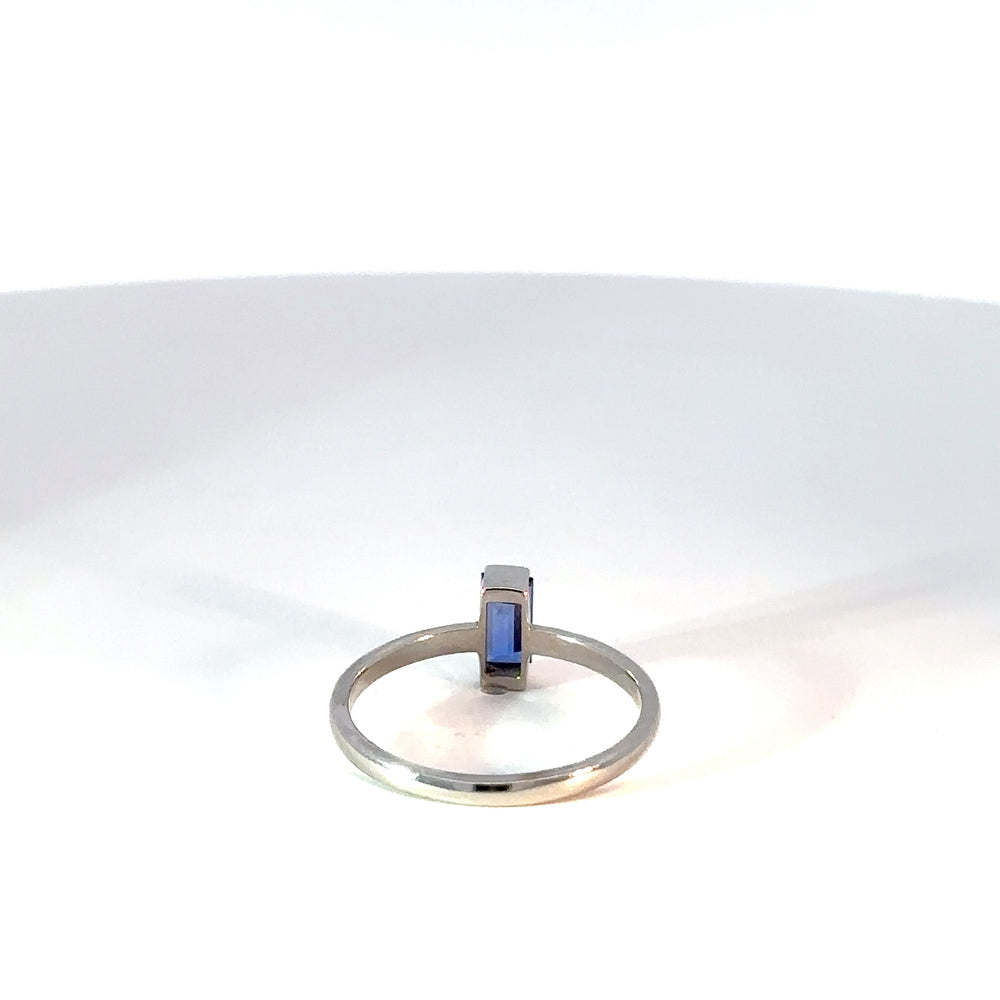 Anillo tipo banda en oro blanco 18k con un zafiro azul profundo 0.54ct, talla baguette y corte step, engastado en un diseño minimalista. Esta joya irradia elegancia y sofisticación, perfecta para quienes buscan un toque de color y distinción en su estilo diario.