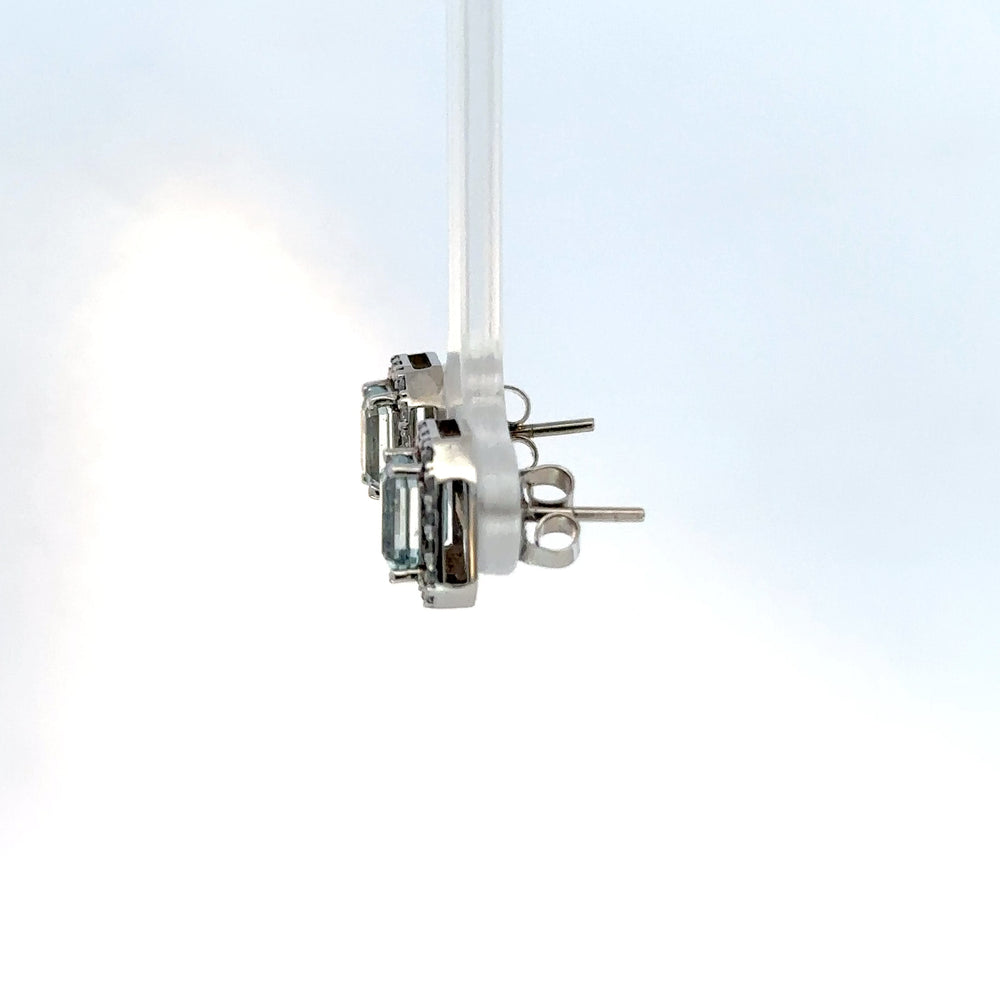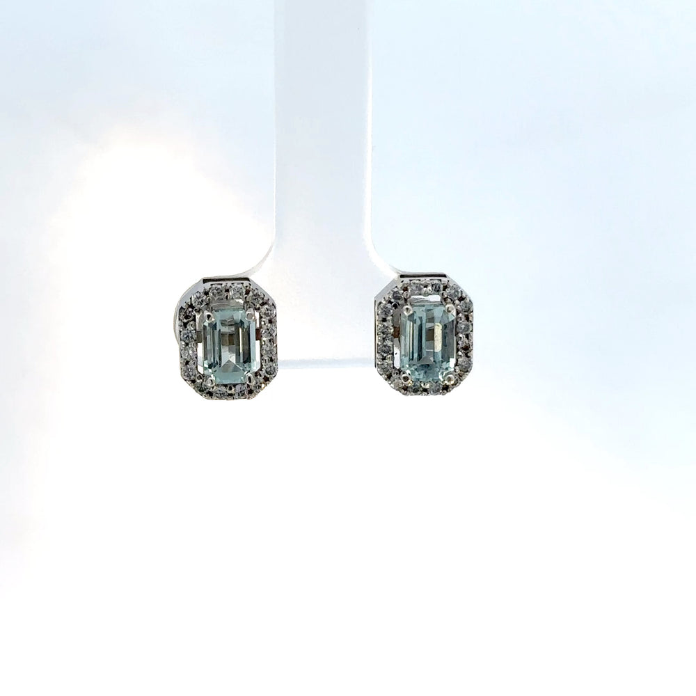 Aretes tipo halo en oro blanco, adornados con aguamarinas naturales 1.22ct . El color azul verdoso claro de estas gemas evoca la serenidad del mar, ofreciendo un toque de distinción y elegancia sutil. Perfectos para añadir un brillo delicado a cualquier atuendo.