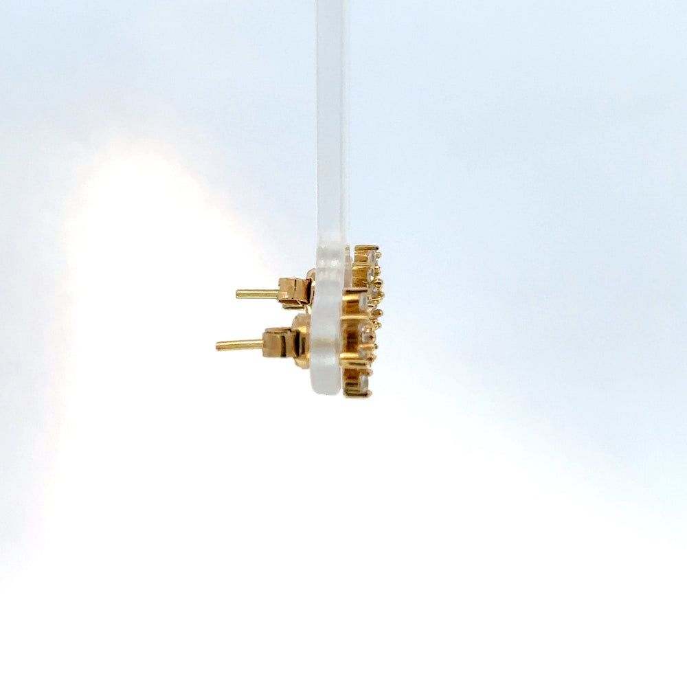 Deslumbrantes aretes tipo copo de nieve, elaborados en oro amarillo radiante, diseño copo de nieve con incrustaciones de circones de talla brillante que maximizan su luminosidad y brillo. Ideales para añadir un toque de elegancia sutil y sofisticación a cualquier atuendo, estos aretes son perfectos para la mujer moderna que aprecia la joyería fina y el diseño atemporal.