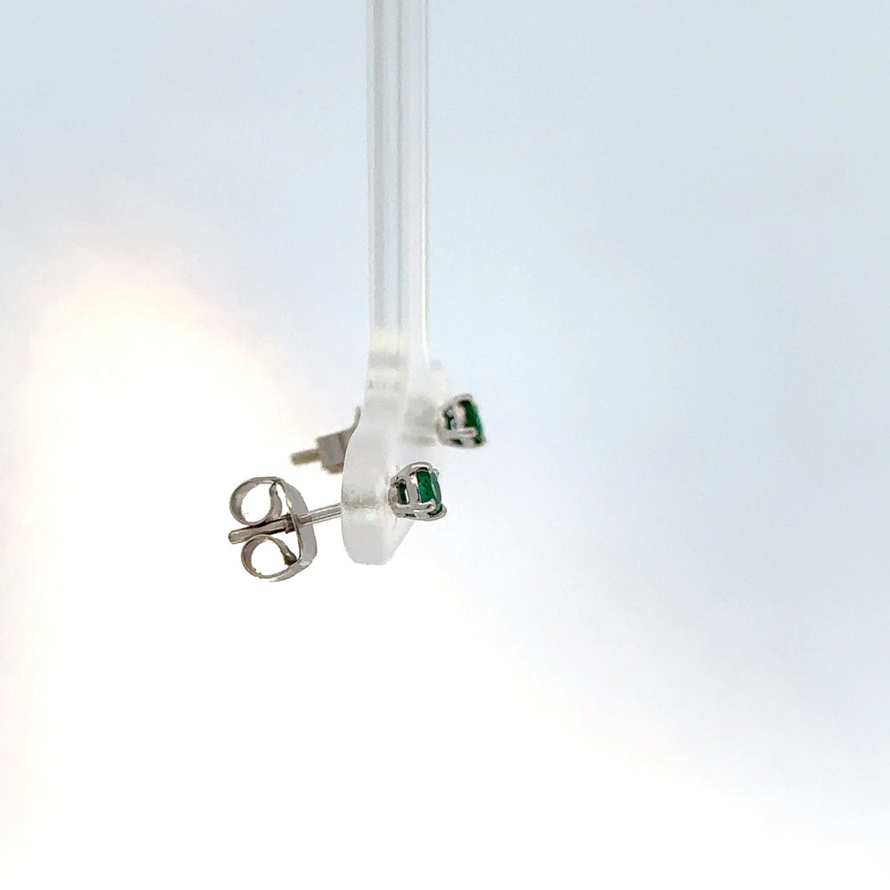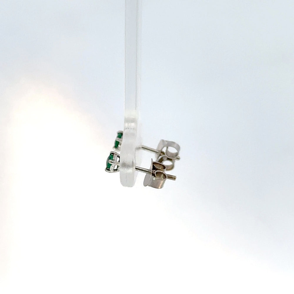 Luce una elegancia sutil con estos delicados pendientes de botón en oro blanco, realzados por un deslumbrante esmeralda de talla brillante redonda 0.14ct. Su color verde intenso y pureza capturan la luz de manera excepcional. Perfectos para añadir un toque de sofisticación discreta a cualquier atuendo.