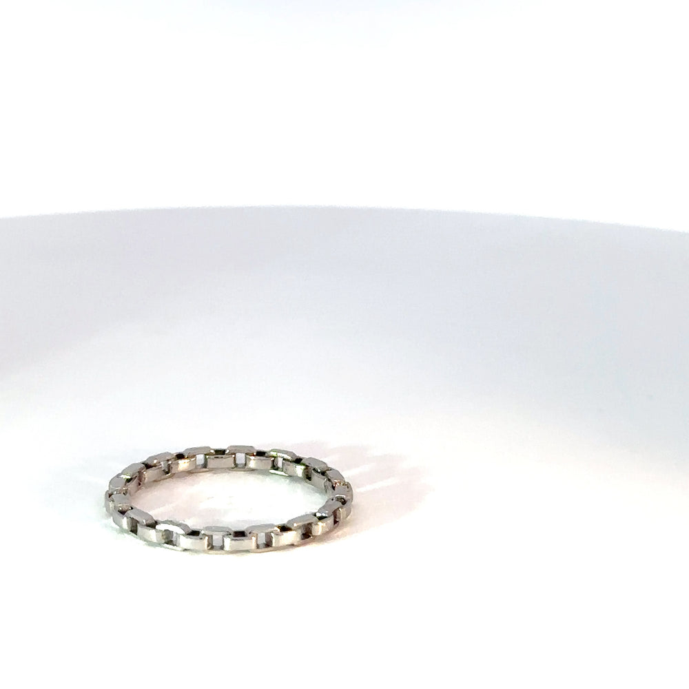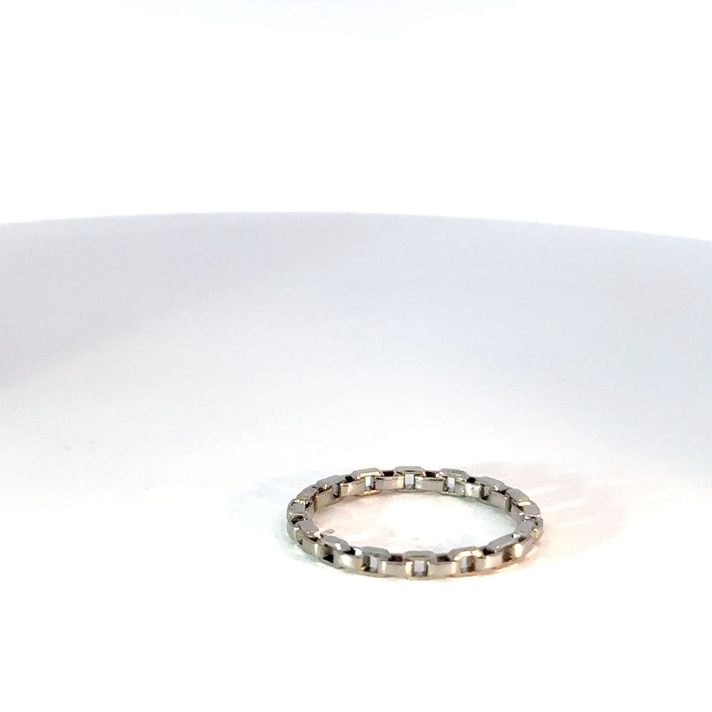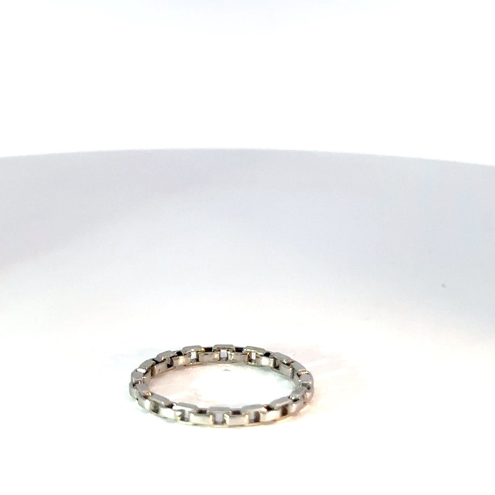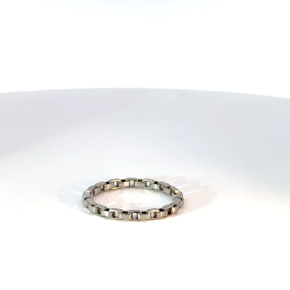Descubre la elegancia minimalista con este anillo tipo banda, elaborado oro blanco. Su diseño moderno de eslabones entrelazados ofrece un estilo único y sofisticado. Ideal para llevar solo o combinar con otros anillos, esta joya complementa cualquier atuendo con sutileza y distinción. Un accesorio imprescindible para el día a día.