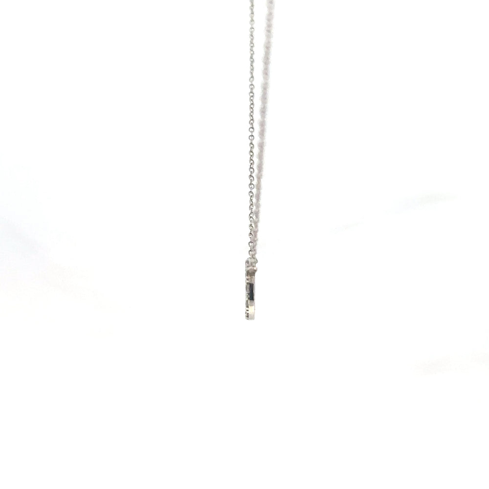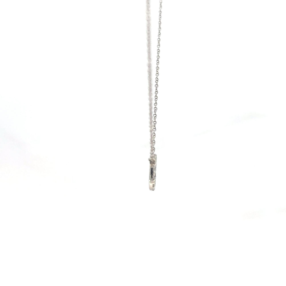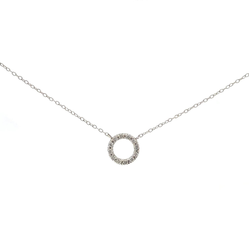 Delicado collar con cadena de oro blanco 18k y un elegante colgante circular cuajado de diamantes 0.18ct de talla brillante. Una joya sutil y sofisticada, ideal para añadir un toque de luz a cualquier atuendo. Perfecto para lucir en ocasiones especiales o como un accesorio diario lleno de elegancia discreta.