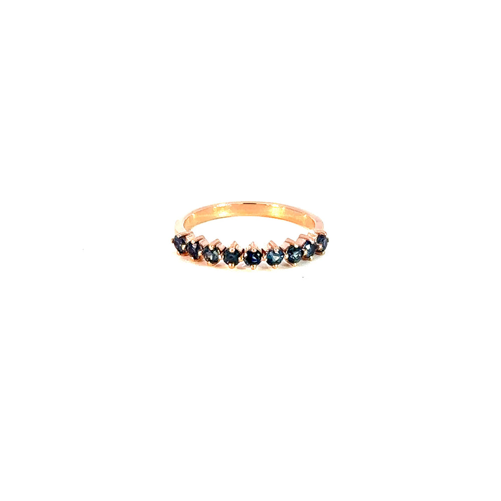 Este elegante anillo tipo cintillo, elaborado en oro rosado 18k, presenta una hilera de zafiros genuinos de talla redonda. El color brillante de las gemas garantizan un brillo y una claridad excepcionales.