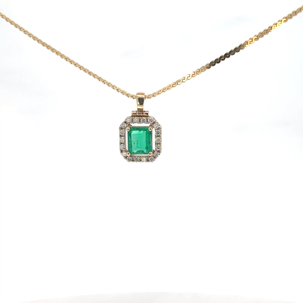 Dije en oro amarillo, destacando una esmeralda natural colombiana de 0.70ct y diamantes naturales de alta calidad 0.18ct, conocido por su distintivo corte y color verde intenso. Esta joya realza cualquier atuendo con su elegancia atemporal, capturando la luz con cada movimiento. Ideal para añadir un toque de sofisticación y color a su colección de joyería fina.