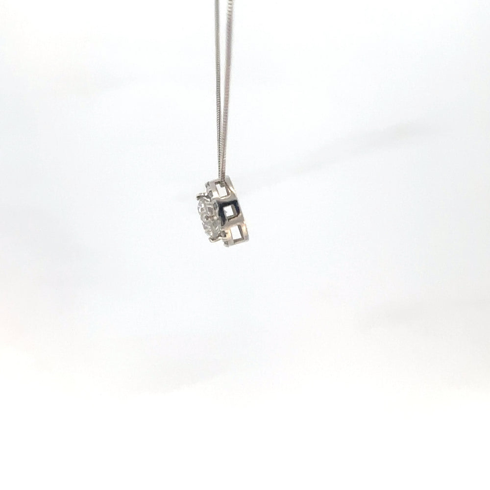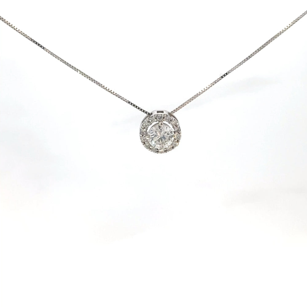 Dije en oro blanco diamante central natural 0.70ct rodeado de diamantes naturales de decoración 0.20ct, realzado por un deslumbrante diamante de talla brillante. Esta joya de diseño ofrece un brillo excepcional y una elegancia atemporal. Ideal para añadir un toque de sofisticación a cualquier atuendo, este collar es una pieza imprescindible en cualquier colección de joyería fina.