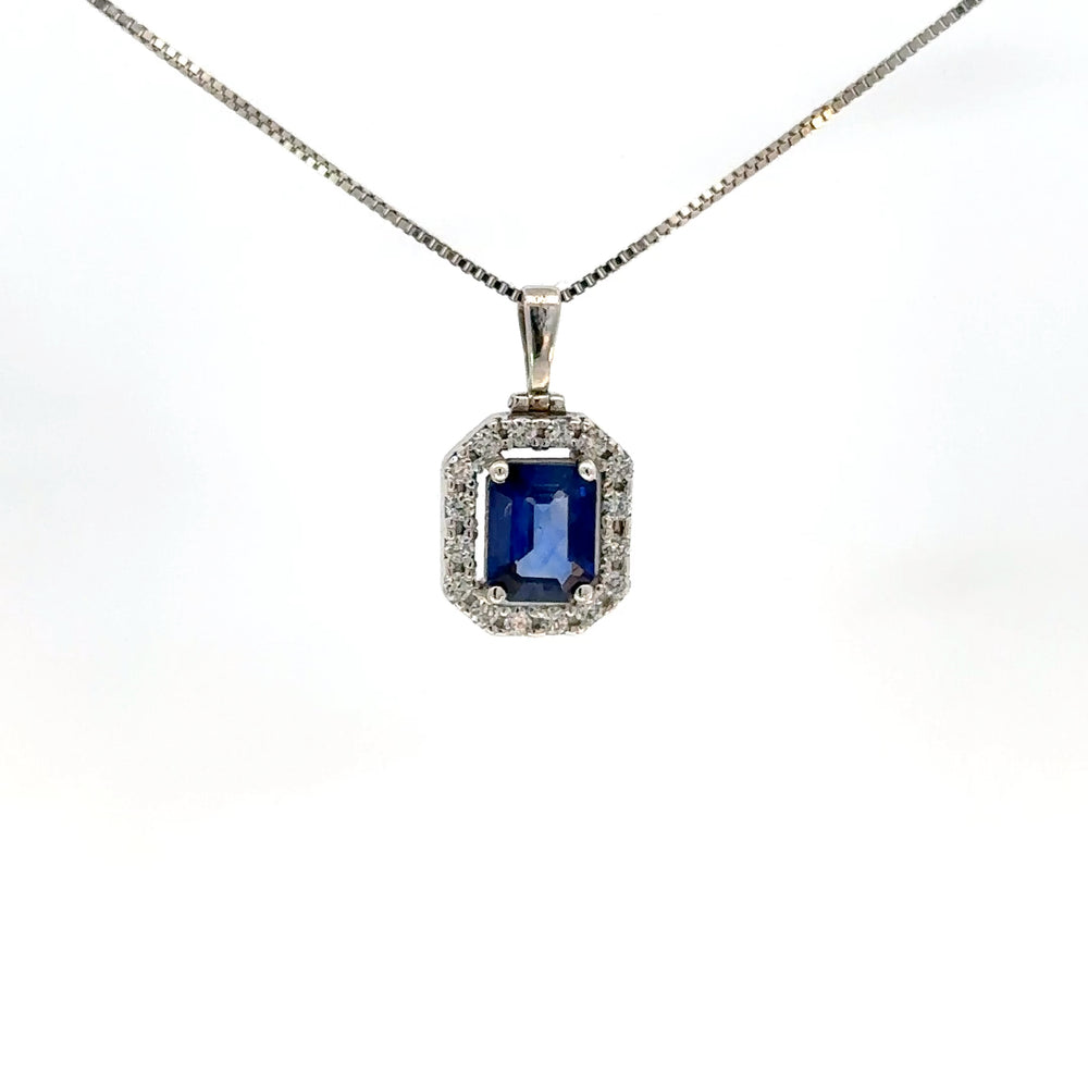 Exquisito dije en oro blanco, realzado por un zafiro azul profundo de talla esmeralda. El corte step del zafiro y su engaste meticuloso maximizan su brillo y pureza. Una joya de diseño clásico que irradia elegancia y sofisticación, ideal para resaltar cualquier ocasión especial.