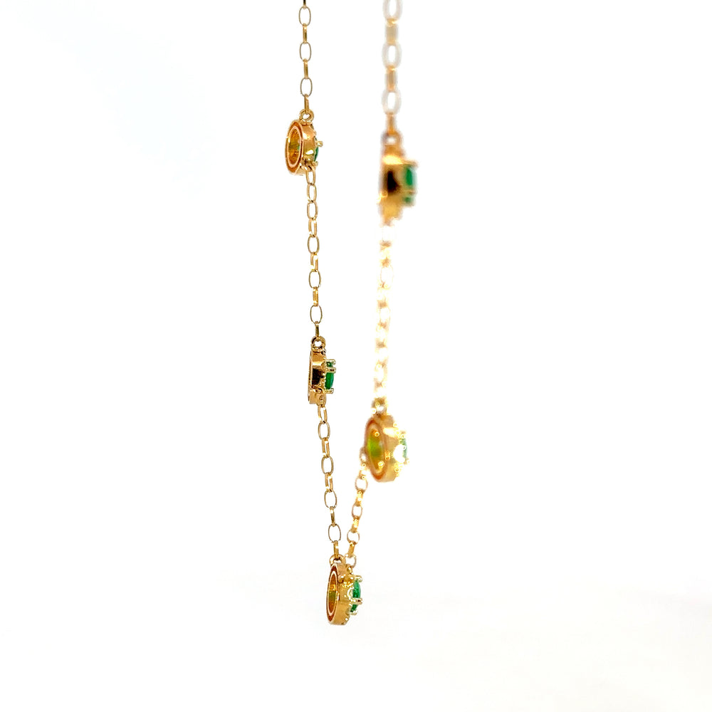 Este collar deslumbrante presenta un diseño delicado con esmeraldas naturales 0.94ct y diamantes alrededor 0.50ct, perfectas para realzar cualquier atuendo. La cadena dorada complementa las piedras preciosas, creando una pieza que irradia elegancia y sofisticación.