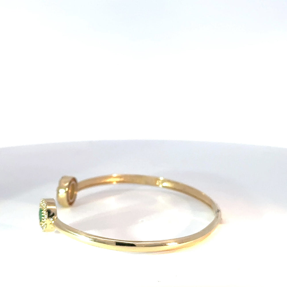Esta elegante pulsera tipo brazalete en oro amarillo irradia sofisticación. Presenta esmeraldas redondas de corte redondo que capturan la luz con su brillo característico. Perfecta para añadir un toque de color y lujo discreto a cualquier atuendo, esta joya es una declaración de estilo refinado.